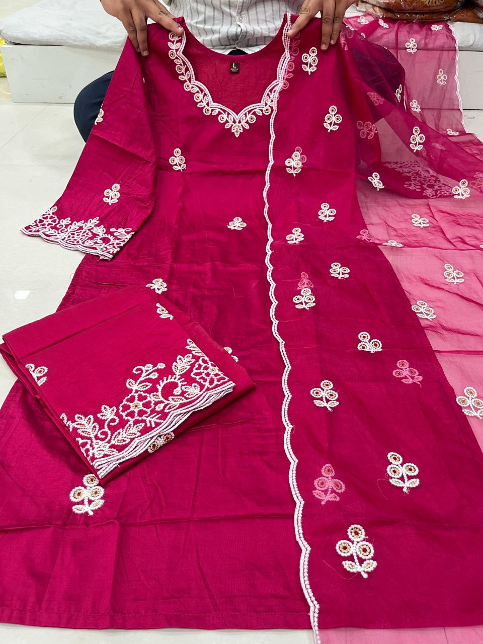 Cotton Thread Embroidery Kurti Palazzo Dupatta